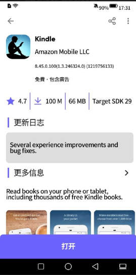 2. 安裝好app後,從Aurora Store右下角紫色的搜尋鈕,搜尋並安裝Kindle app